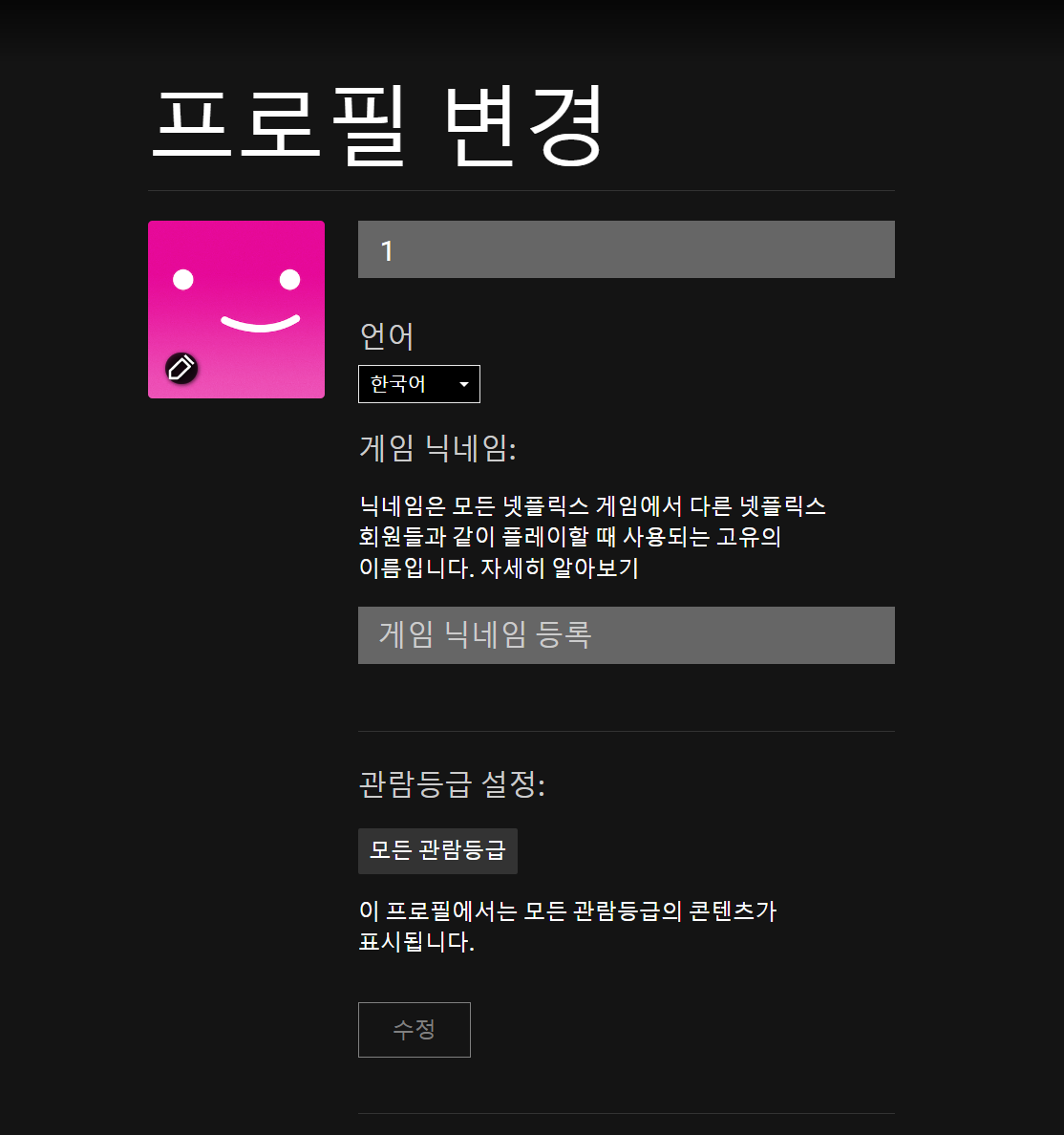 넷플릭스에 접속 후 첫 화면입니다. 이 화면에서 밑에 있는 프로필 관리를 클릭해 줍니다.