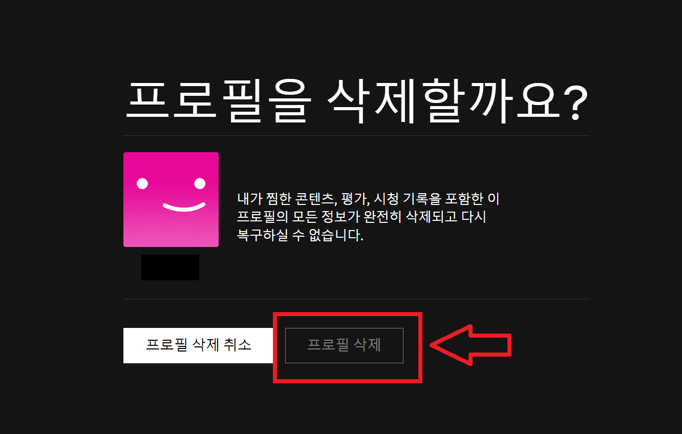 한 번 더 확인 창으로 바뀌게 되고 여기에서 프로필 삭제를 눌러주면 됩니다. 그러면 원하시는 넷플릭스 프로필 삭제가 완성됩니다.