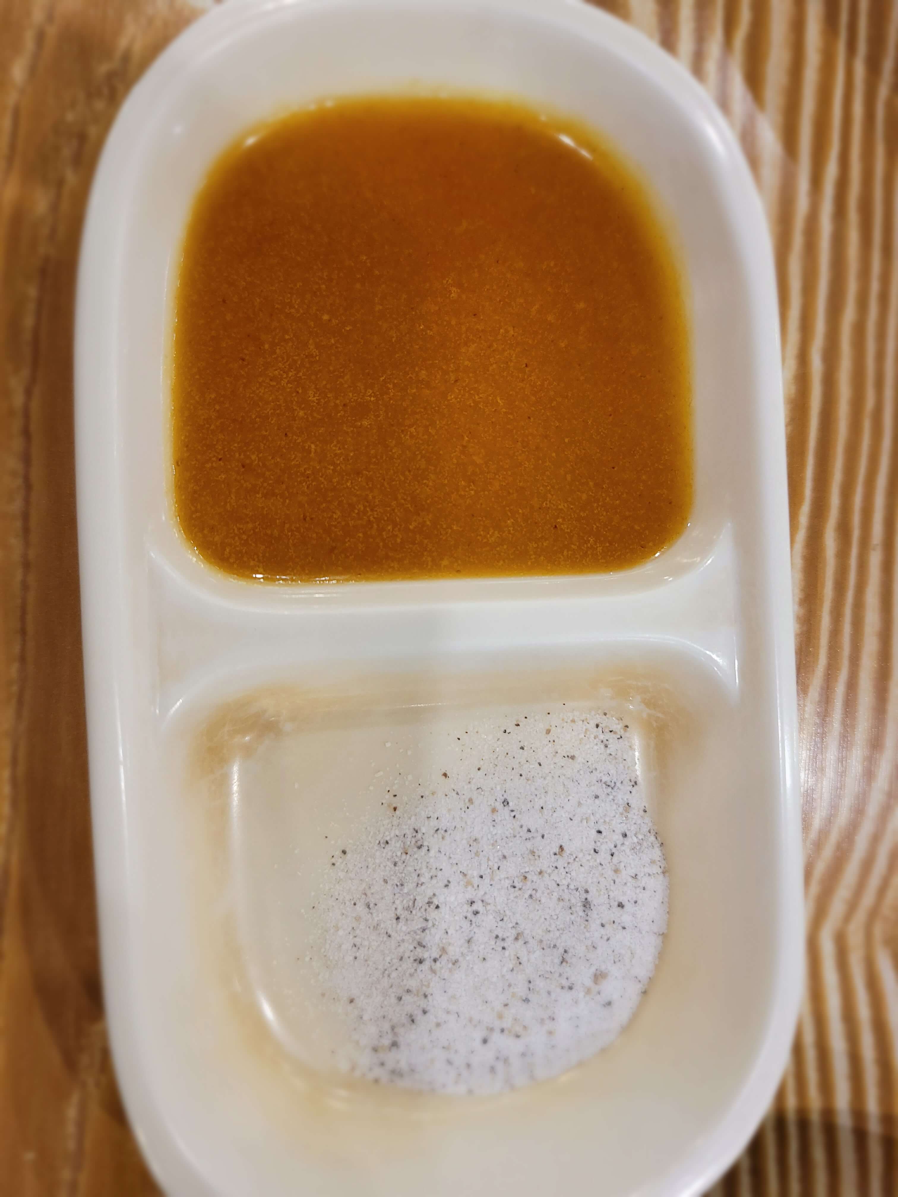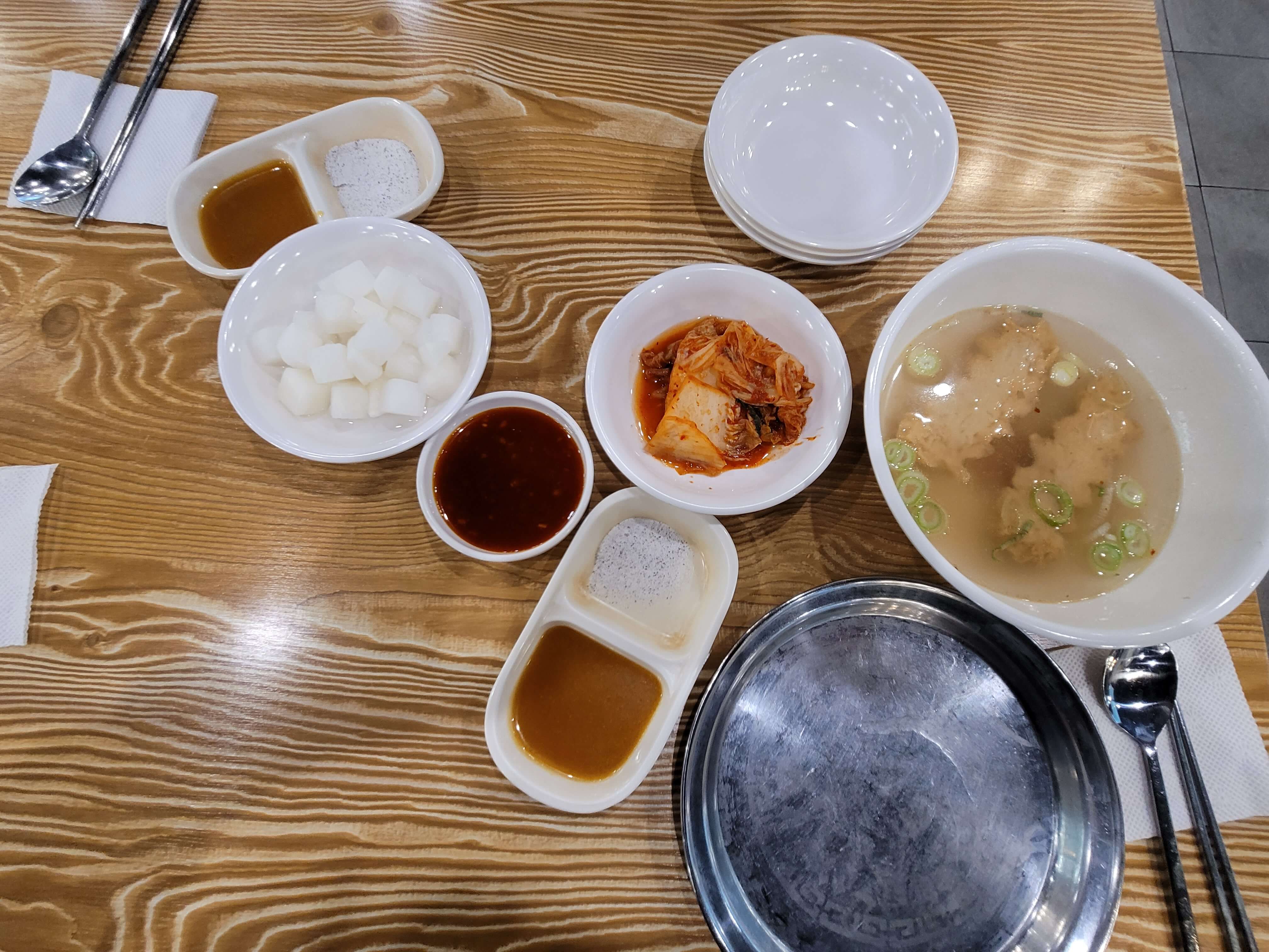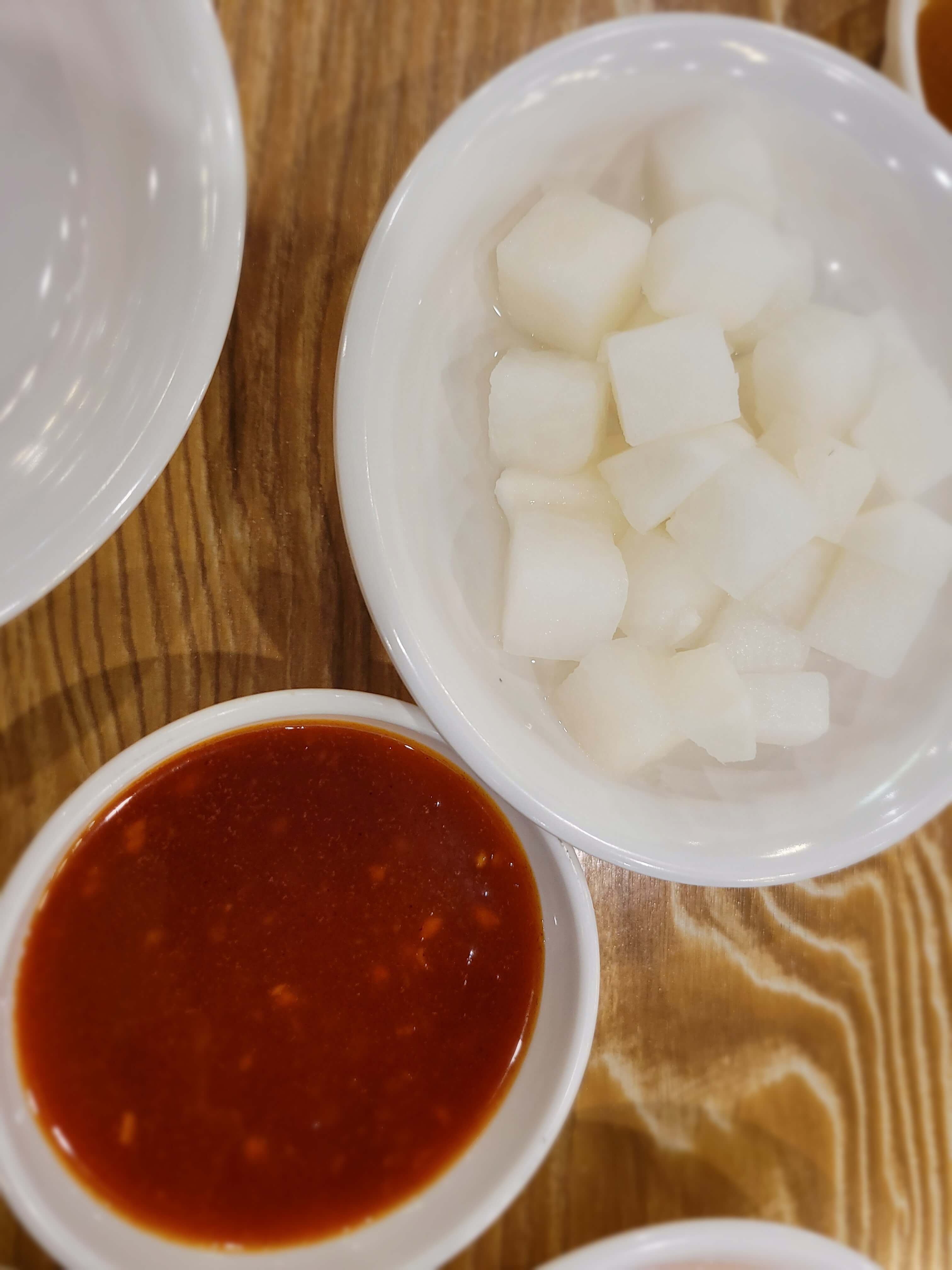 장작구이 먹기전에 기본으로 제공되는 사이드 음식들 입니다. 무우, 양념소스, 소금후추, 김치, 오뎅 입니다. 따로 셀프바가 있어서 부족하면 더 이용가능합니다. 예전에 시장에서 먹는 튀김 닭에 무우와 함께 먹었던 추억의 맛 입니다.
