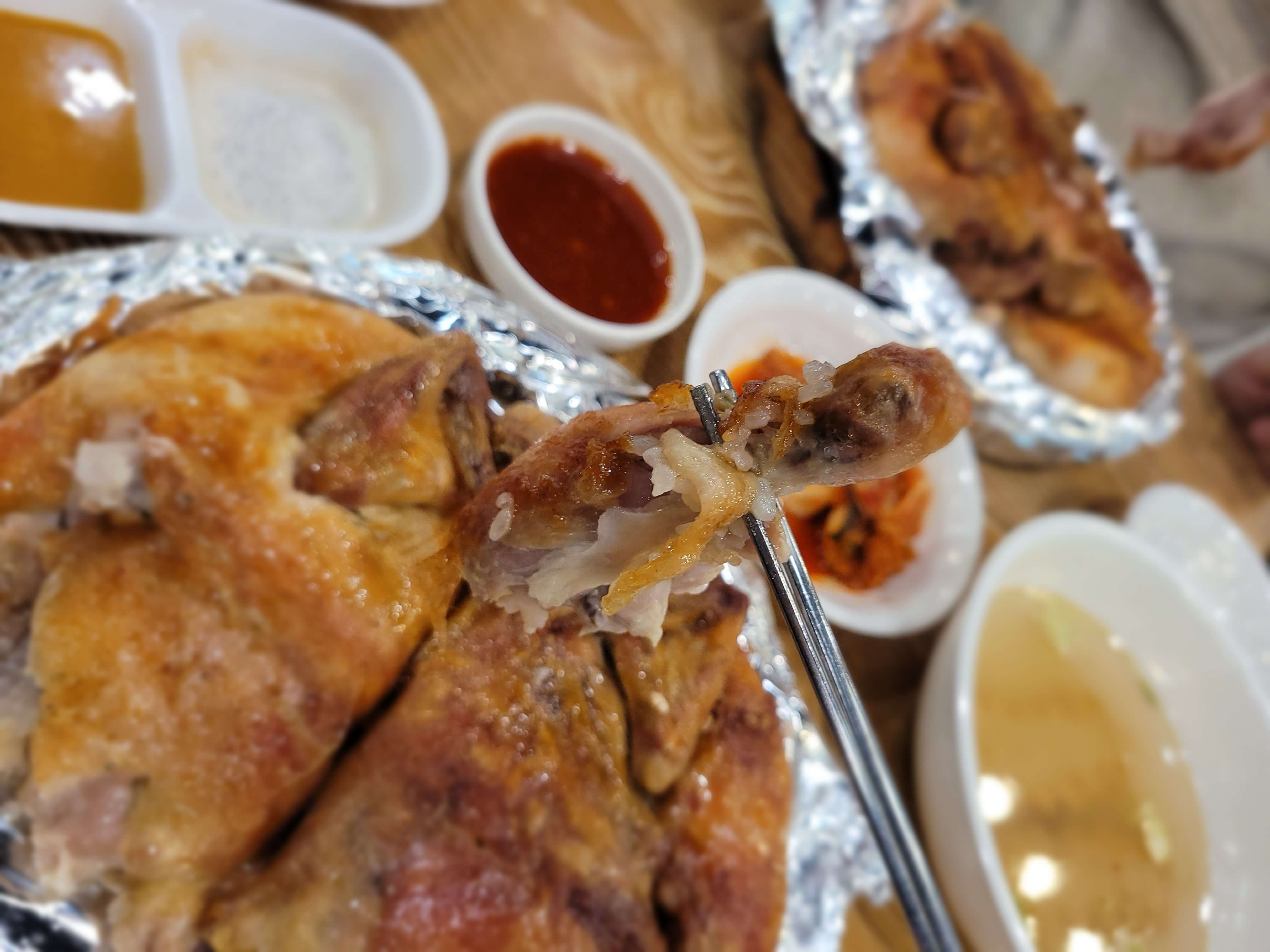 닭 한마리가 나왔습니다. 사이즈를 봤을 때는 너무 적은 것 아닌가 생각했는데 먹으면 먹을수록 공복을 채우는 꽉 찬 맛에 푸짐하게 먹었습니다. 닭 안에 맛있는 밥도 들어있고, 겉바속촉의 느낌을 그대로 맛볼 수 있습니다. 속은 부드러워서 입안에서 사르르 녹고 겉은 바삭바삭 부서지는 맛이 일품입니다.