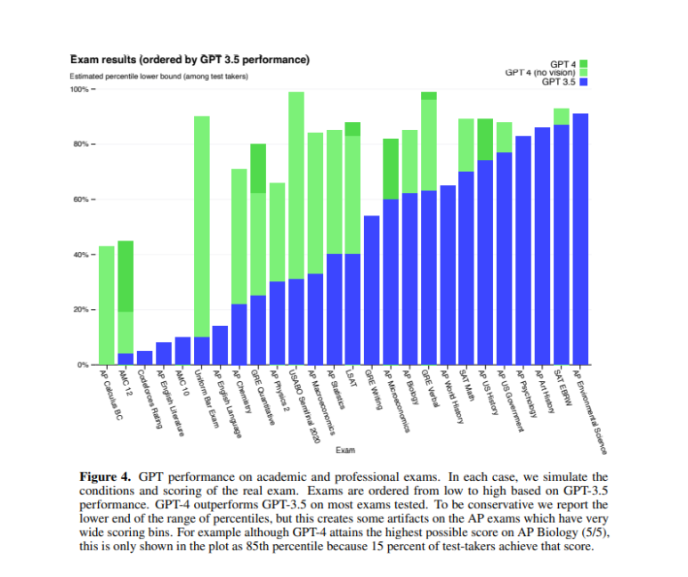기술보고서에 있는 그래프 에서는 실제 시험 조건과 채점 기준이 적용된 시뮬레이션 전문 시험에서 GPT-4의 성능이 GPT-3.5보다 훨씬 향상된 것을 알수 있습니다.