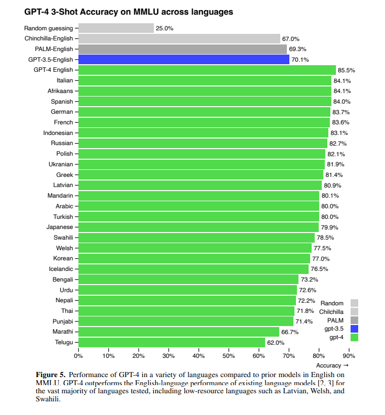 다양한 언어의 MMLU벤치마크에서 이전 영어보델과 비교한 성능을 보여줬습니다. 라트비아어, 웨일스어, 스와힐리어와 같은 소스가 적은 언어를 포함하여 테스트한 대부분의 언어에 대해 영어로 된 기존 언어 모델보다 성늘이 뛰어나다고 합니다.