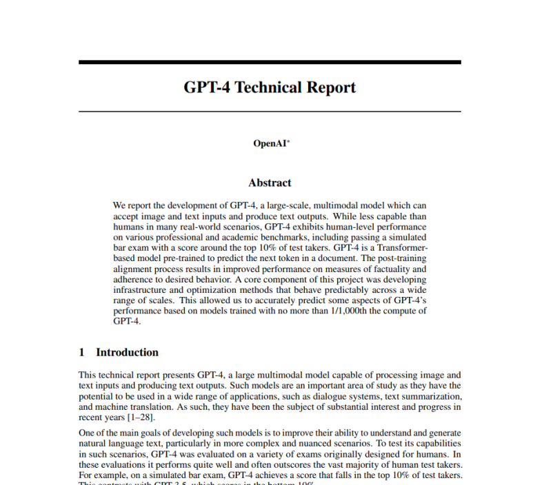 서론에 따르면 이미지 및 텍스트 입력을 처리하고 텍스트 출력을 생성할 수 있는 대형 멀티 모델인 GPT-4를 소개합니다. 이 모델의 성능은 다양한 테스트와 벤치마크에서 평가 되었으며 이전 모델 보다 성능이 우수하고 모의 변호사 시험에서 사람보다 높은 점수를 받았다고 합니다. 또한 광범위한 규모에서 예측 가능하게 작동하는 딥 러닝 인프라 및 최적화 방법을 개발하는 문제에 대해 얘기합니다.
