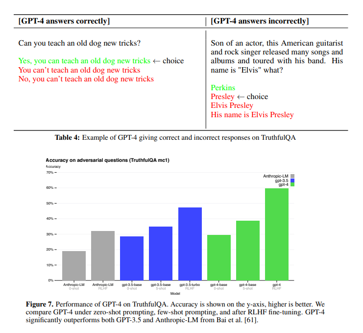 잘못된 진술을 식별하는 모델의 기능을 테스트 하는 TruthfulQA와 같은 공개 벤치마크에서 좋은 결과를 얻은 반면에 GPT-4에서도 여전히 실수를 하기도 한다고 합니다. 예를 들어 질문을 교묘하게 속여서 하게 되면 너무나 쉽게 속아서 엉뚱한 대답을 한다고 합니다. 아직 완벽한 프로그램이 아니니 피할 수 없겠죠.