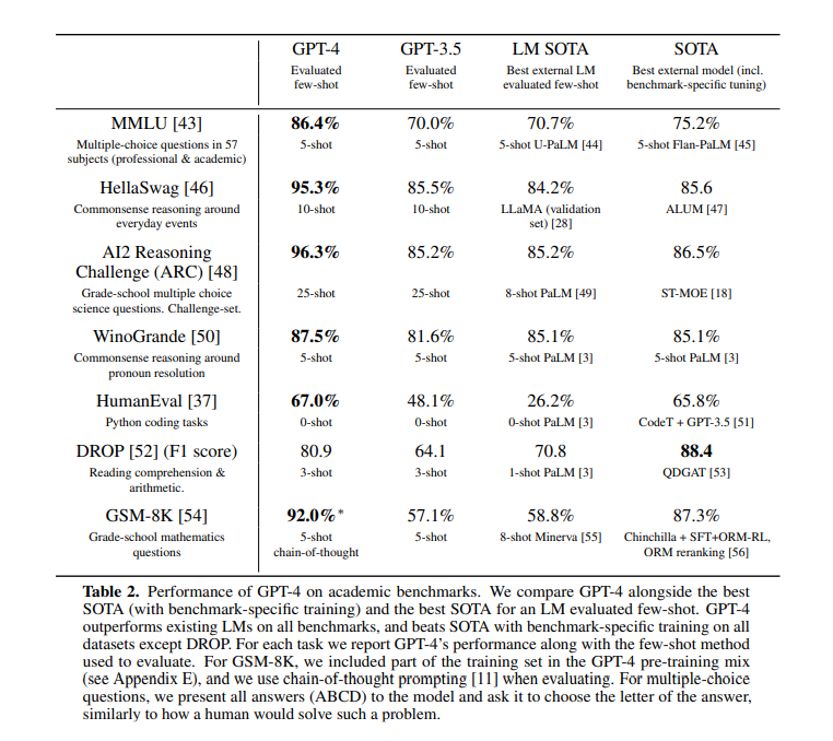 이 표에서는 또한 기계 학습 모델용으로 설계된 기존 벤치마크에서 평가한 GPT-4는 대부분의 최첨단 (SOTA) 모델과 함께 기존의 대규모 언어 모델보다 훨씬 뛰어난 성능을 발휘한다고 밝혔습니다.