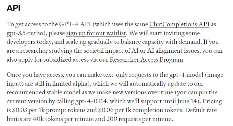 바로 오늘이네요! 오픈AI 홈페이지를 확인해 보니 챗gpt-4의 API를 챗gpt PLUS 사용자와 개발자들에게 대기자 명단에 등록하여 엑세스 할 수 있게 하였습니다.