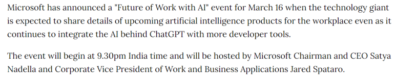 또한 이 행사는 인도 시간으로 오후 9시 30분에 시작하며, 마이크로 소프트의 회장 겸 CEO인 사티야 나델라와 기업 업무 및 비즈니스 애플리케이션 부사장인 제라드 스파타로가 주최한다고 합니다. 이 3월 16일 마이크로 소프트가 진행하는 이벤트에서 챗gpt 4.0을 공개하지 않을까라고 많은 사람들이 예상하고 있습니다.