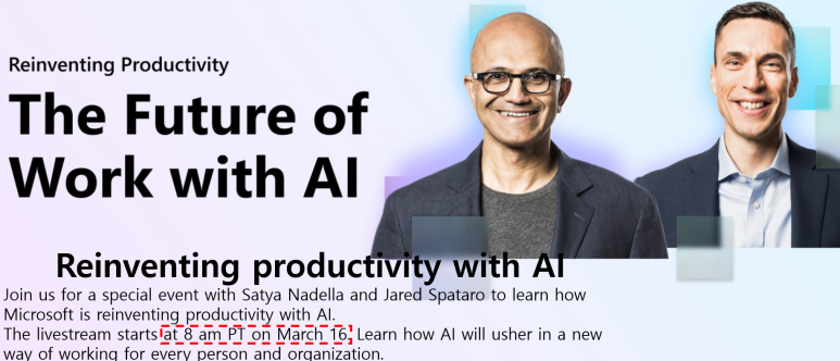 마이크로 소프트의 3대 CEO인 사티아 나델라는 오늘 3월 16일에 (내일이네요) "Future of Work with AI" 이벤트를 발표했습니다.