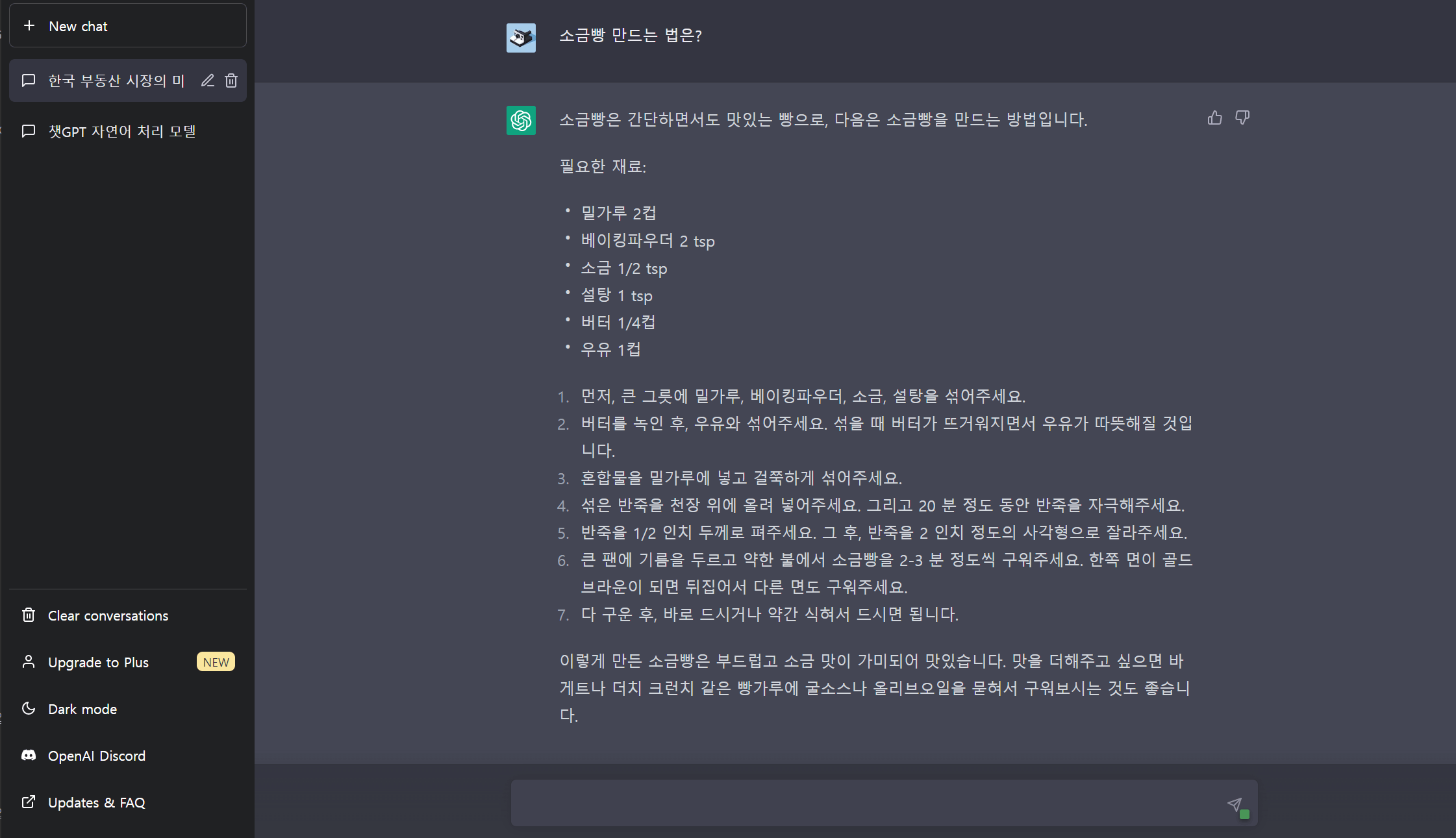 요즘 소금빵에 빠져 있어서 소금빵 만드는 법에 대해 물어보았습니다. 이런 대답은 정말 잘해주는 거 같습니다. 명확한 답이 내려져 있는 정보성의 질문은 좋은 답을 얻을 수 있는 거 같습니다.